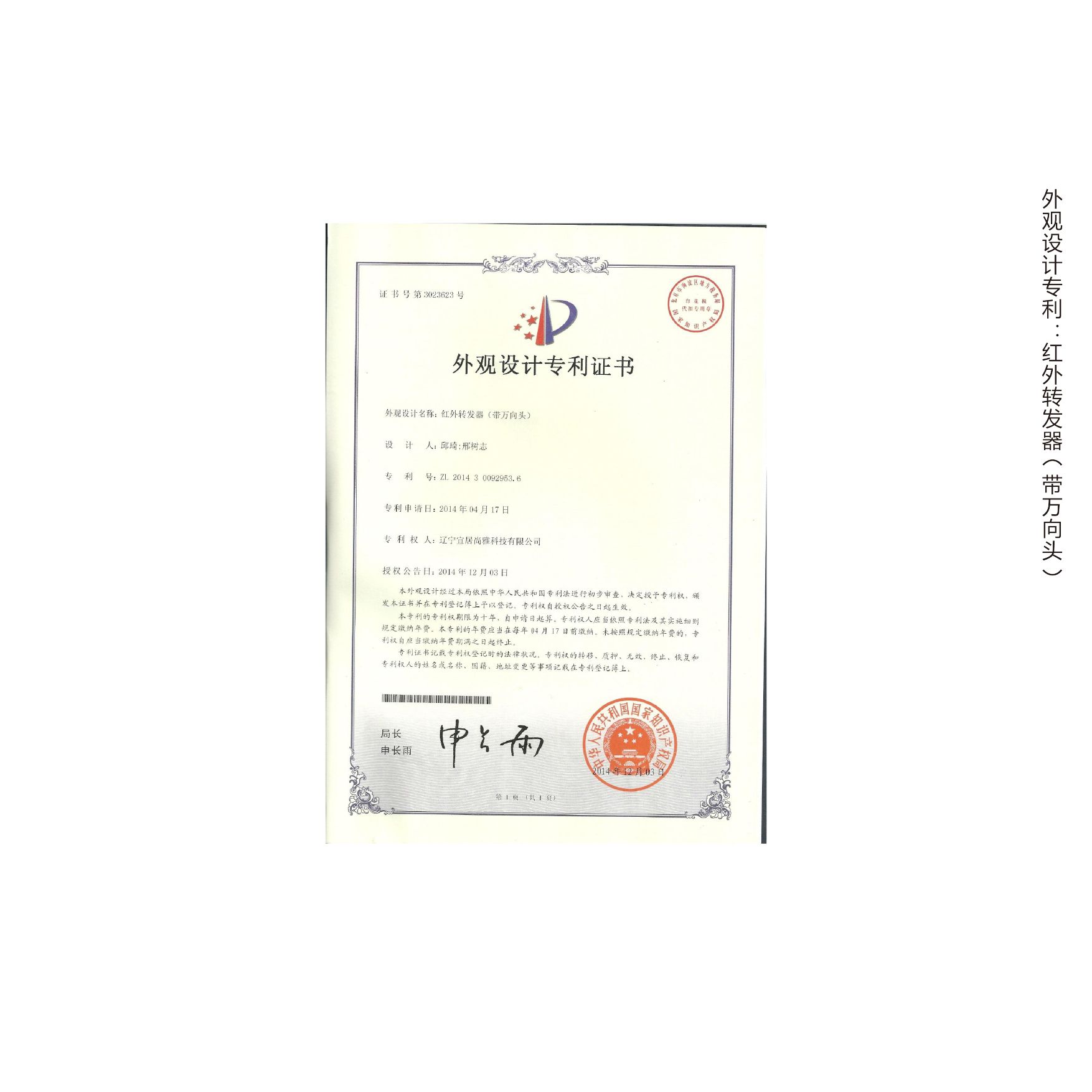 外观设计专利:红外转发器(带万向头)